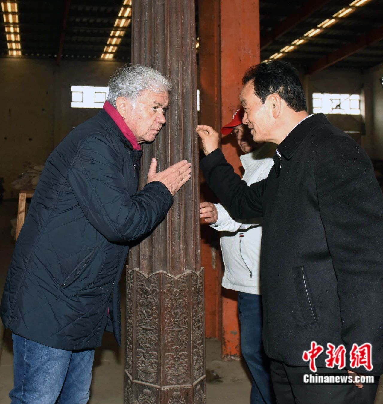 2018年11月7日,拉希德阿利莫夫(左一)做为时任上合组织秘书长,来到安徽蚌埠“湖上升明月”中华古平易近居博览园参不雅调查。图为拉希德阿利莫夫正在细细倾听来自敲打老木头的声音。中新社发 钟欣 摄?。