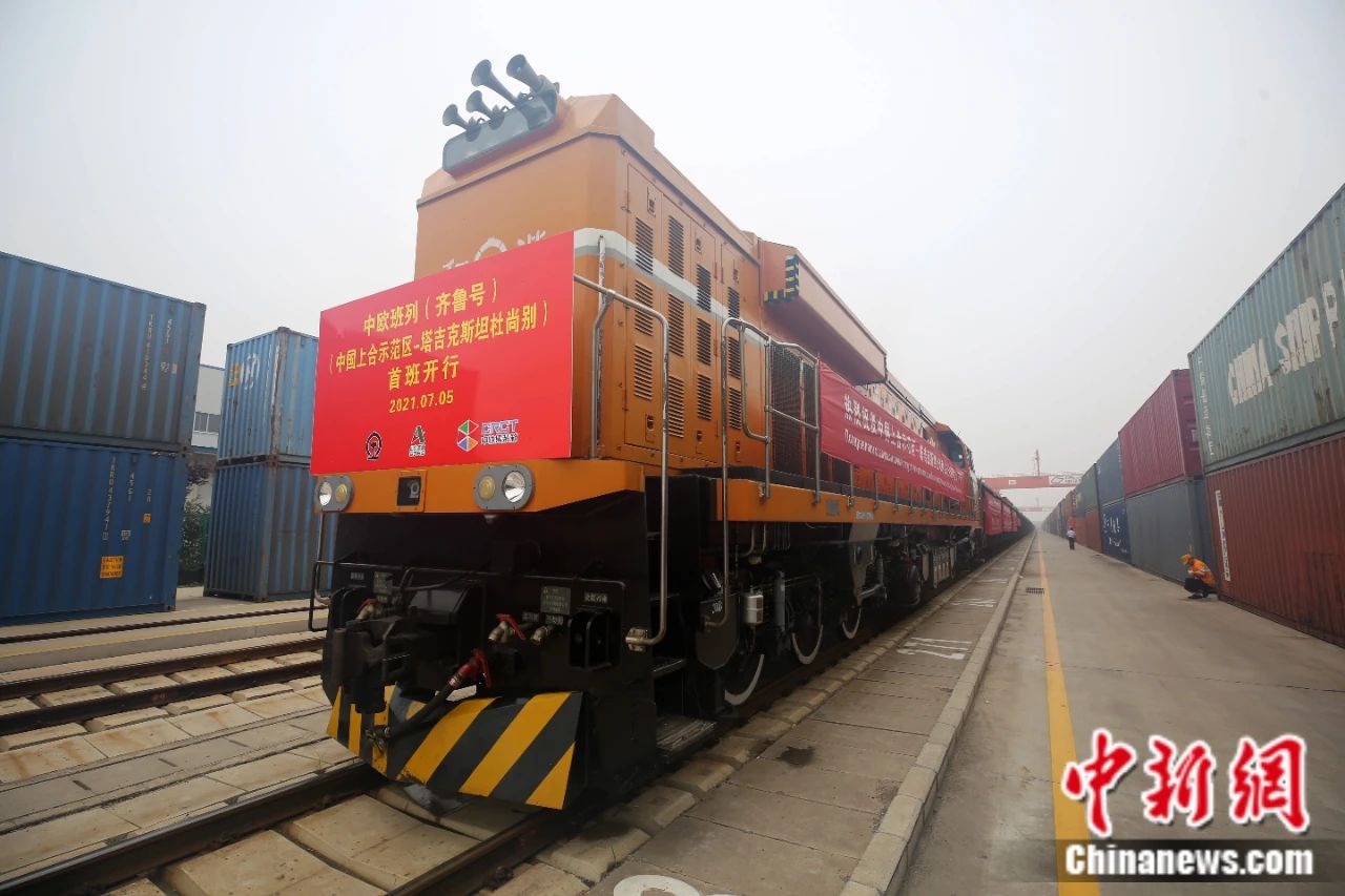 2021年7月5日, 中国上海合做组织处所经贸合做示范区(简称“上合示范区”)前去塔吉克斯坦首都杜尚此外首班中欧班列(齐鲁号)“上合快线”发出,从上合示范区青岛多式联运核心启程。中新社记者 胡耀杰 摄!